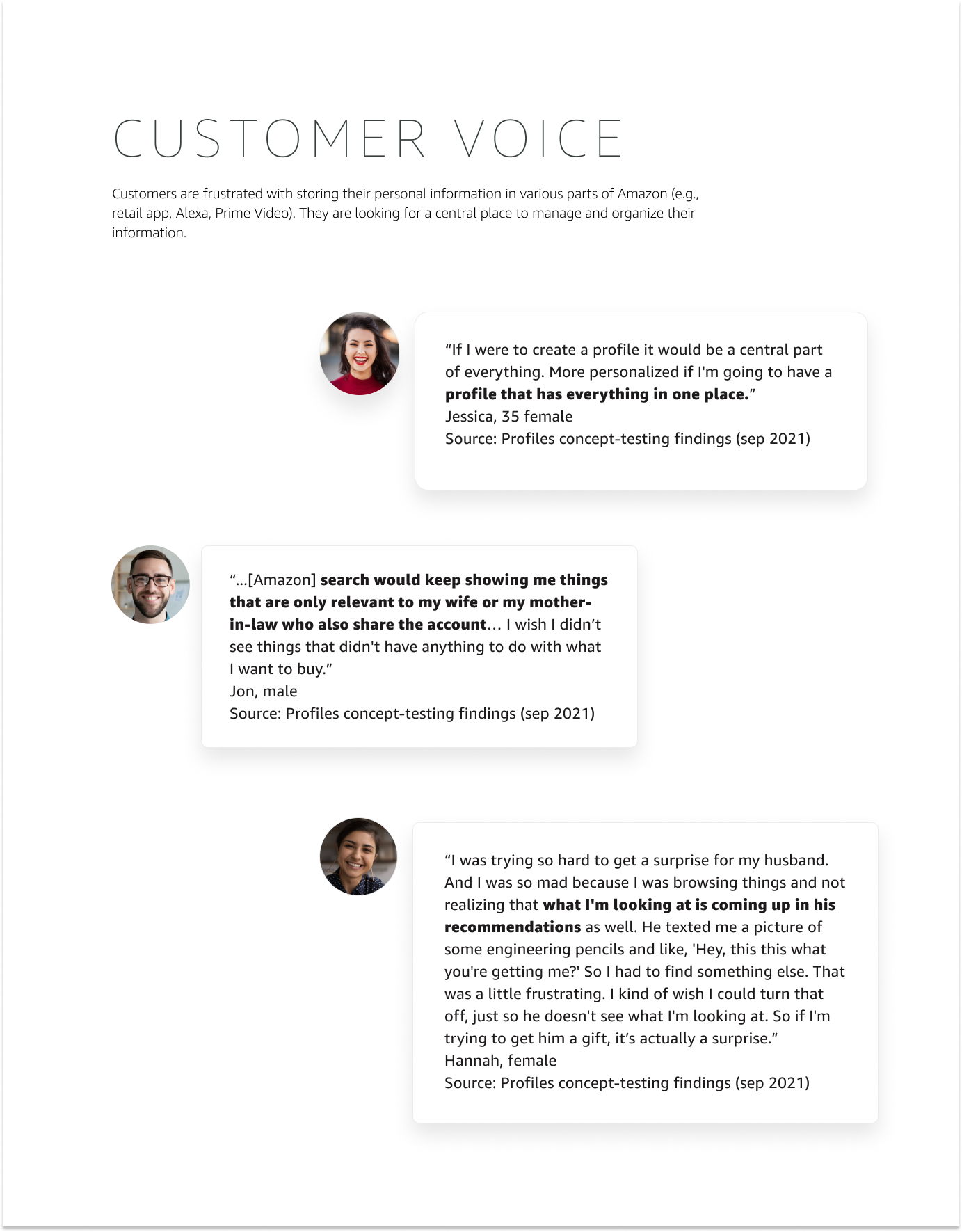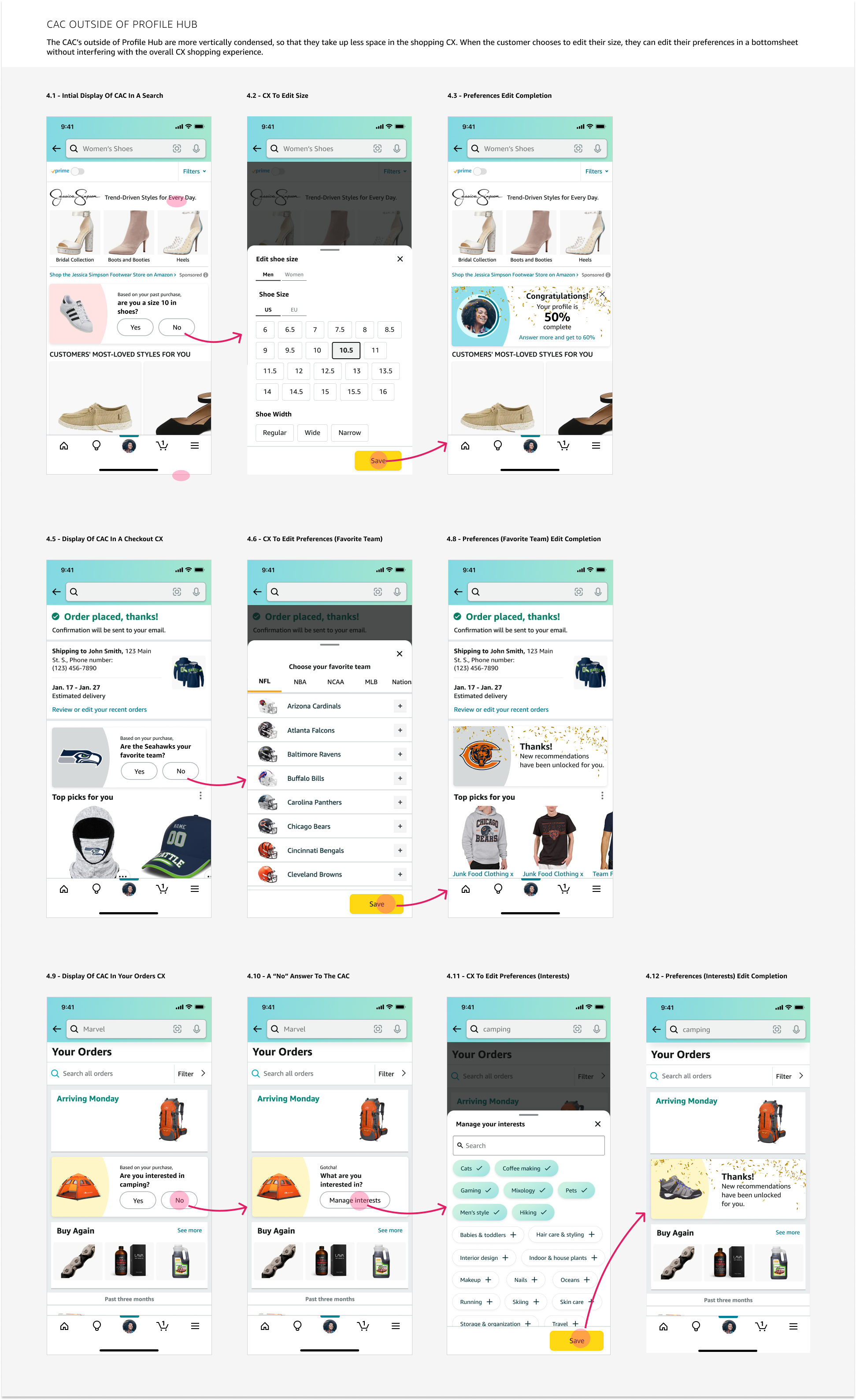 Customers who journey to Profile Hub are expecting to engage in all personalized profile related content. Not just to add or remove attributes from their preferences, in a jarring form like way, but in a contextual form, while also trusting that Amazon has already learned purchase patterns (see 1.1 -b). Since we have concluded multiple people use the same amazon account we wanted to make sure recommendations don’t get tainted between customers, so in a case that a customer did’t know they are able to create additional profiles, we are making them know in an easy intuitive way (see 1.1 - e and 1.3). We also brought into the space influencers and brands followed since it was an actual struggle to find that information before (see 1.1 -f,g).